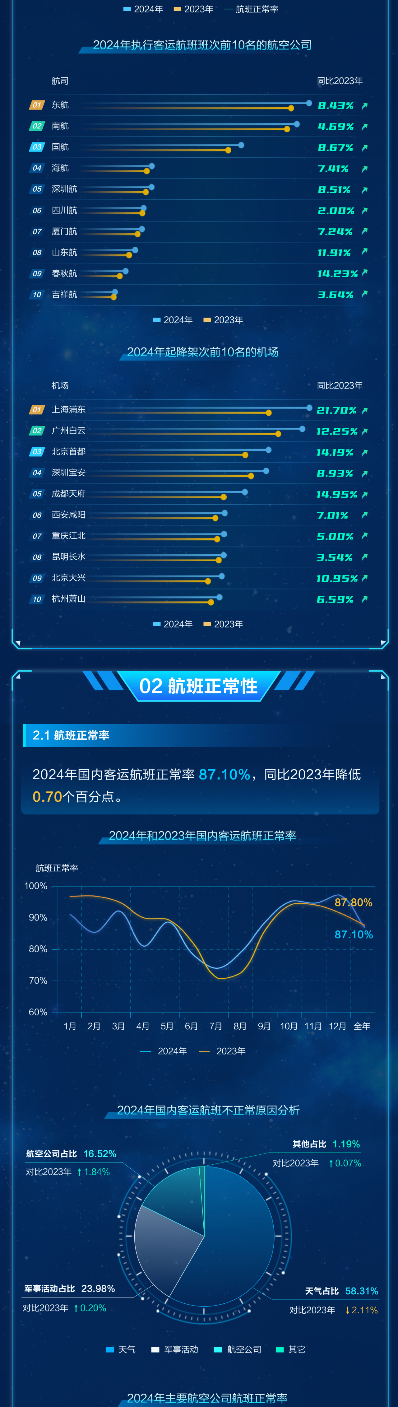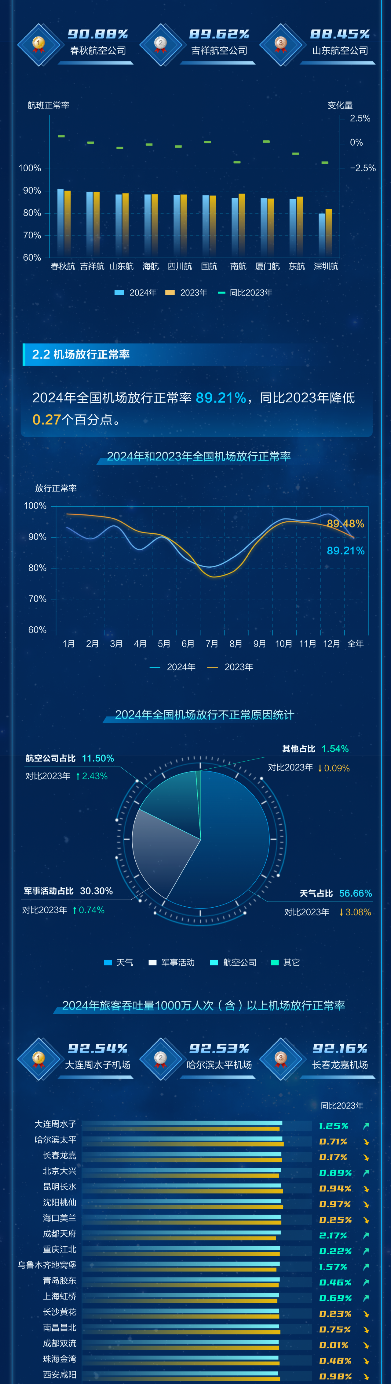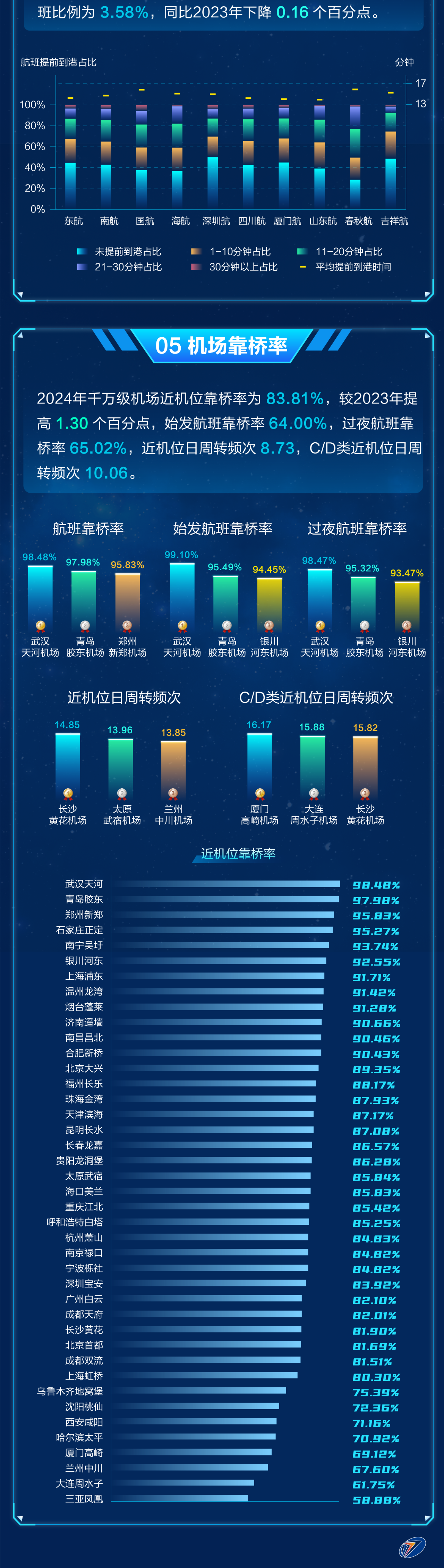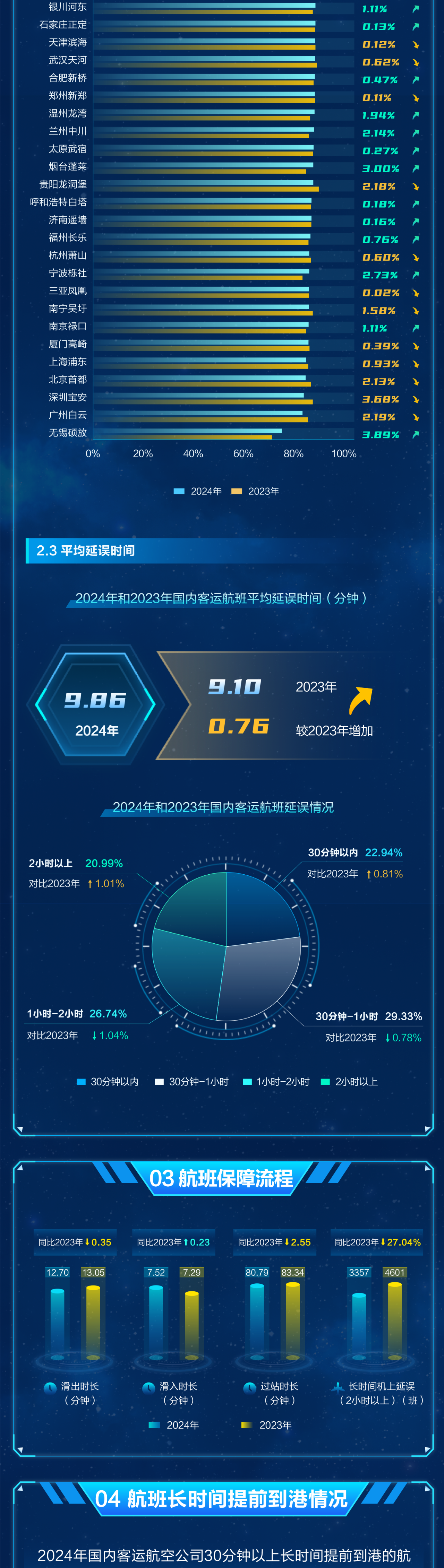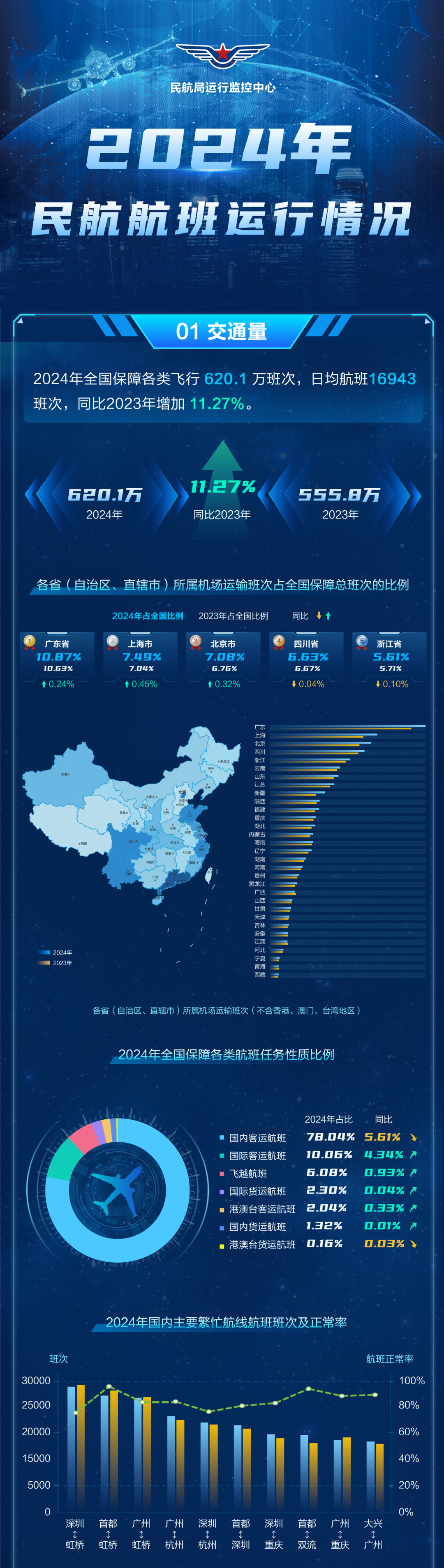 中国民航网 通讯员周薇 报道:2024年,全国共保障各类航班620.1万班次,日均16943班次,同比增加11.27%,全年国内客运航班正常率为87.1%,连续7年保持在80%以上。民航局运行监控中心依据预先飞行计划和实际运行情况,从交通量、航班正常性、航班保障流程、航班长时间提前到港及机场靠桥率五方面对2024年民航航班运行整体情况作了统计。(编辑:金杰妮 校对:王亚玲 审核:韩磊)