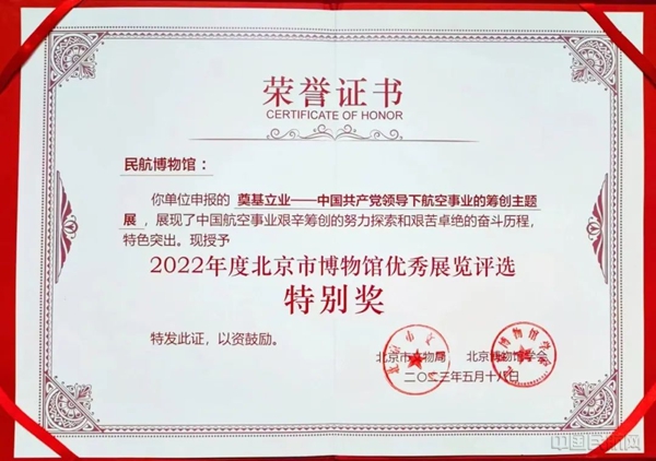由北京市文物局主办的“2022年度北京市博物馆优秀展览评选”结果在今年国际博物馆日北京主会场揭晓,民航博物馆“奠基立业——中国共产党领导下航空事业的筹创”主题展荣获“特别奖”。