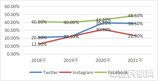 2021年度中央企业在Twitter、Facebook、Instagram三大国外社交平台的入驻率发展趋于平缓甚至下降。2020年到2021年,入驻Twitter平台的中央企业比例从39.2%降至38.5%;在Instagram平台,由于2021年仅按照总账号计算,不算地方分号,因此相比2020年注册Instagram账号的中央企业比例由30.9%下降至22.9%;中央企业在Facebook平台整体表现相对突出,入驻Facebook平台比例由43.2%上升至48.5%。