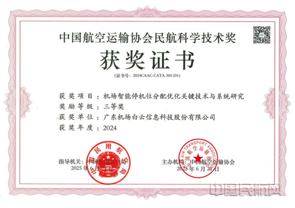 中国民航网 通讯员李庆泰、项嘉懿 报道:近日,广东机场白云信息科技股份有限公司(以下简称“白云信科”)凭借“机场智能停机位分配优化关键技术与系统研究”项目,荣获2024年度中国航空运输协会民航科学技术奖三等奖。这一奖项不仅是对白云信科技术创新能力的认可,更标志着白云机场运行管理智能化水平迈上新台阶。