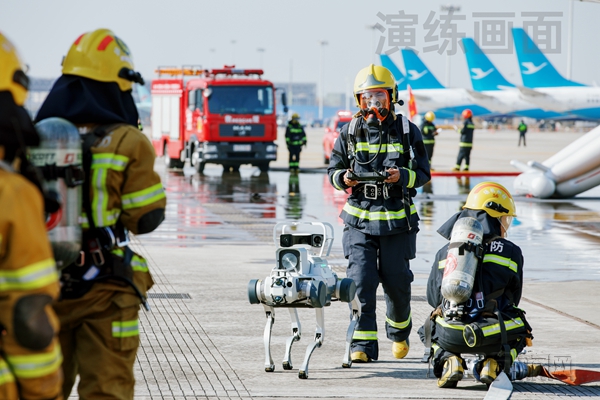 演练中首次应用了两类专业应急救援装备。四足应急救援机器狗化身“钢铁战士”,搭载生命探测仪与多气体传感器,兼具5G远程操控与自组网通讯功能,完成浓烟机舱内被困人员精准定位、高危环境无人化侦查任务,并实现救援现场数据的实时回传与指挥中心的远程精准调度。型号为AW139救援直升机紧急起飞,将重伤员跨区域快速转运至异地医院,实现了空中生命支持的无缝衔接,有效提升了应急救援的科技化、专业化与高效化水平。