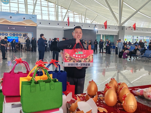 上午11时,喀什机场在T2候机楼内举行了庆祝活动,精心准备了喀什特色器乐演奏《喀什赛乃姆》、舞蹈《我的爱献给祖国母亲》等文艺节目和砸金蛋游戏,为旅客乘机旅途带来意外惊喜。随着欢快的民族音乐响起,身着艾德莱斯绸的舞者们以一场热情洋溢的开场舞迅速点燃现场活动气氛。不少旅客主动加入舞动区域,随着音乐翩然起舞,来自天南海北的旅客们纷纷驻足,举起手机记录下这难忘的场景。砸金蛋环节将现场气氛推向高潮。金蛋中准备了艾德莱斯工艺品、航空模型、特色干果等丰富礼品。每一次金锤落下,都伴随着欢呼与掌声。活动现场还进行了抖音直播,为不能在现场参加活动的人们提供了网络观看选择,达到1.6万人次观看点赞。