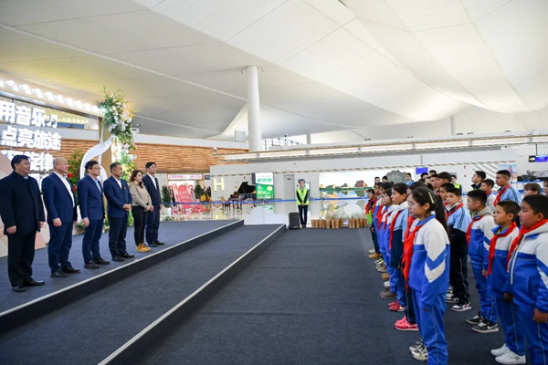 “小朋友们,大家好!欢迎来到乌鲁木齐,开启你们为期三天的研学之旅”新疆机场集团党委书记、董事长陶润文,党委副书记、总经理吕辉斌在乌鲁木齐天山国际机场航站楼迎接孩子们的到来。