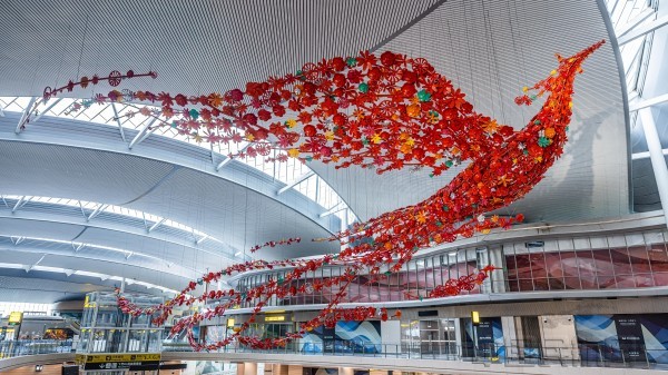走进T3B航站楼,处处皆是文化印记。以巴渝神鸟为灵感,由3000余朵山茶花造型汇聚而成的“火凤渝飞”艺术装置,成为旅客朋友圈必打卡的城市标志;52米水墨长卷《峡江千里图》震撼陈列,全景展现长江三峡的雄奇风貌;《山水之城》《英雄之城》《梦幻之城》《未来之城》四组指廊长卷,以艺术语言串联重庆的自然禀赋、人文底蕴和发展愿景。机场与重庆市文联共建重庆空港文化艺术空间,接续推出“印象山城”摄影展、“墨海启航”书法展、“马跃新程”画展等展览活动,成为推动重庆优质文艺资源直达基层的创新实践,也为往来旅客提供了美好、温馨、富有文化内涵的出行体验。