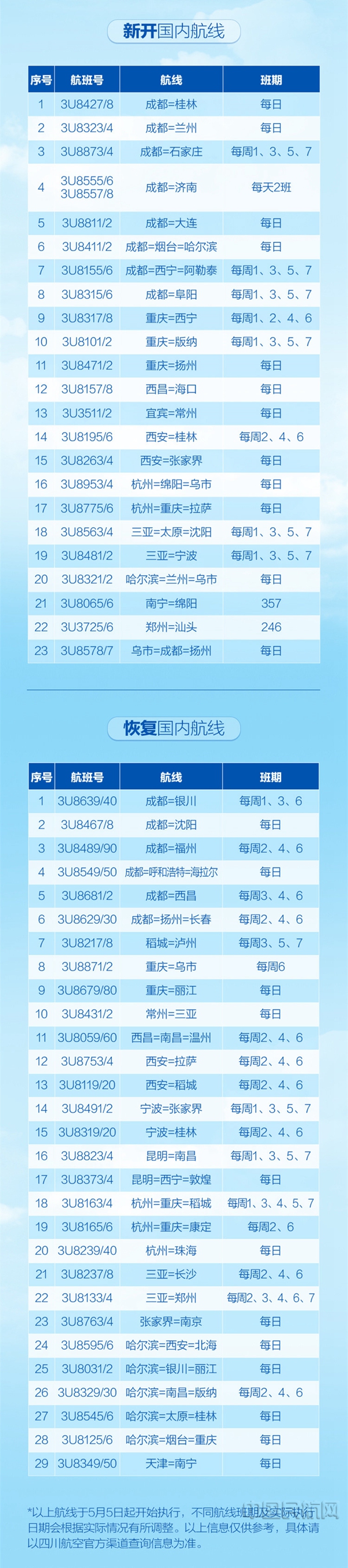 《中国民航报》、中国民航网 记者郝蒙 通讯员代依依、孙成豪 报道:5月3日起,全国民航将进入夏航季。为满足旅客夏秋季节出行需求,四川航空积极调整新航季航班计划,将新开、恢复50余条国内航线,打造5条成都至重点机场的空中快线。