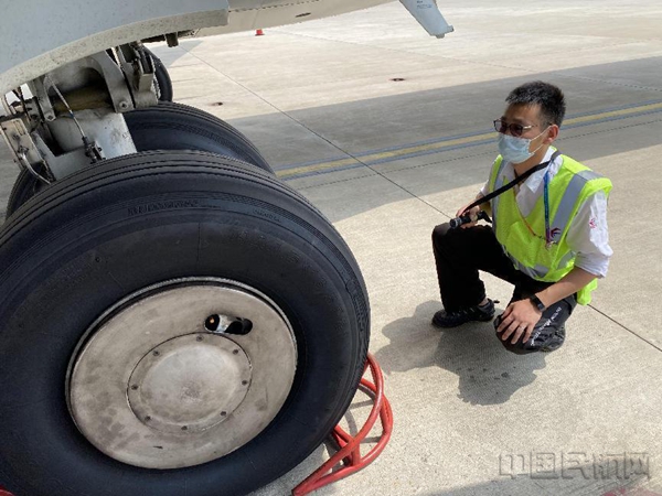 邱步云检查飞机起落架、轮胎