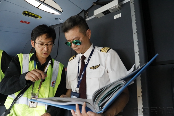 航班起飞前,机务工程师与季红华机长进行最后的工作交接与确认(东航供图)