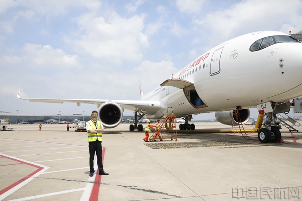 东航空客A350机长季红华正在进行航班起飞前的绕机检查工作(东航供图)