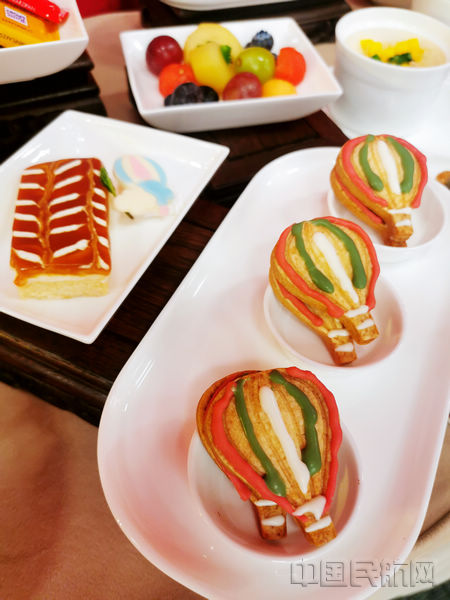 东航为赴伊斯坦布尔首航航班旅客准备了当地旅游特色热气球造型的西点(钱擘/摄)