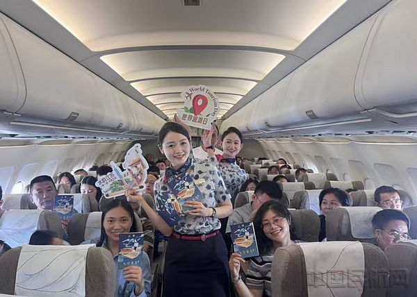 “欢迎您乘坐'世界旅游日'主题航班。”各主题航班上,乘务员手持《世界旅游日南京纪念版飞行日志》和印有南博文物《坤舆万国全图》的手举牌,站在舱门口欢迎旅客登机。登机口旁还摆放了“瞰东方·观天下'世界旅游日'主题航班”易拉宝海报。