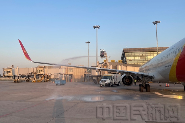《中国民航报》、中国民航网 记者李佳为 通讯员张爽、张勇 报道:11月21日凌晨,西安咸阳国际机场区域温度降至零度以下,早间始发航班需在起飞前进行飞机除霜作业。