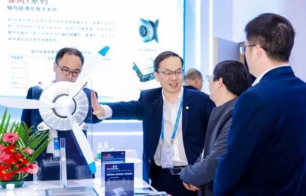 中车株洲电机展台上,“驭风V系列”和“驭风T系列”两款产品引人注目。据介绍,公司将高铁牵引系统的高可靠性及高速永磁电机的高功率密度技术成功延伸至航空电驱领域。“驭风”V系列航空涡电混动发电机系统额定功率涵盖200千瓦至1000千瓦,转速高达20900转/分至44000转/分,发电机效率达96%,控制器效率达98%。其300千瓦、400千瓦级系统已通过满发稳定温升考核,可满足大载重、长航程混合动力飞行器的动力需求。“驭风”T系列轴向磁通推进系统采用盘式结构,轴向尺寸仅为传统电机的二分之一至三分之一,使机身更加紧凑轻薄,可大幅提升装机适配性。其电机效率达95%,控制器效率达98%,持续功率密度为每公斤10牛米,峰值转矩密度达每公斤20牛米,有效适配载人电动垂直起降飞行器(eVTOL)、复合翼无人机等先进飞行器的直驱推进场景。