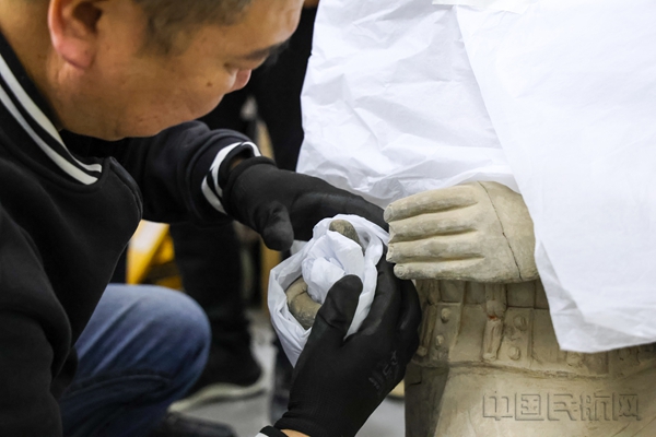 此次借展历经近半年沟通协调,在陕西省文物局指导下促成,恰逢2026年亚航会(2026年亚洲航线发展大会将于4月14日至16日在西安举办)举办,旨在向中外民航从业者及旅客展示陕西文化魅力。押运过程中,工作人员全程谨慎操作,仔细记录文物细节,确保这尊重200多斤的国宝安全抵达。