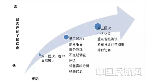民航服务要以旅客需求为出发点和落脚点,因此,了解民航旅客需求,找到服务产品与需求间的差距是民航服务质量管理的重要内容。根据上图(了解客户的方法),我们发现客户自愿投诉是第一层次的,也是企业被动(不需要主动投入财力、物力)获取客户需求的有效途径,如果这个途径保持畅通,民航旅客需求与民航服务之间的差距就可以在不断的改进中越来越小,旅客的满意度和满意率将会快速提升,民航服务质量就会越来越好。